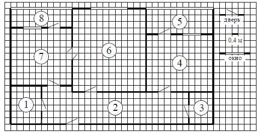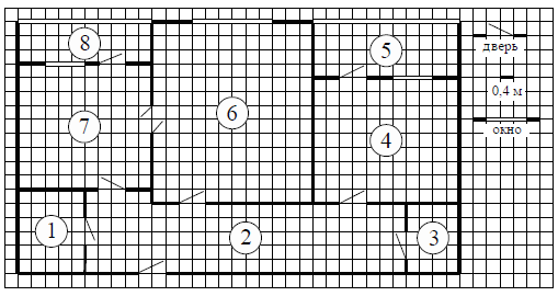 На рисунке изображён план двухкомнатной квартиры в многоэтажном жилом доме. Сторона одной клетки на плане соответствует 0,4 м, а условные обозначения двери и окна приведены в правой части рисунка.