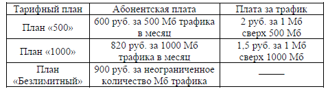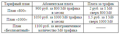 Задание 5. В квартире планируется подключить интернет. Предполагается, что трафик составит 700 МБ в месяц, и исходя из этого выбирается наиболее дешёвый вариант. Интернет-провайдер предлагает три тарифных плана.
