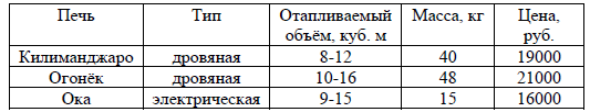 Хозяин дачного участка строит баню с парным отделением. Размеры парного отделения: длина 3,5 м, ширина 2 м, высота 2,1 м. Для разогрева парного помещения можно использовать электрическую или дровяную печь. Три возможных варианта даны в таблице.
