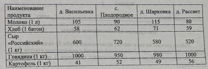 Задание 5. В таблице указана стоимость (в рублях) некоторых продуктов в четырёх магазинах, расположенных в деревне Васильевке, селе Плодородном, деревне Шарковке и деревне Рассвет.