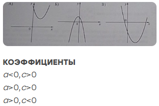 Задание 11. На рисунках изображены графики функций вида y=ax2+bx+c. Установите соответствие между графиками функций и знаками коэффициентов a и c.