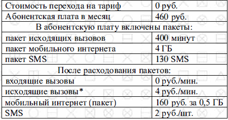 Стоимость минут, интернета и SMS сверх пакета тарифа указана в таблицее.
