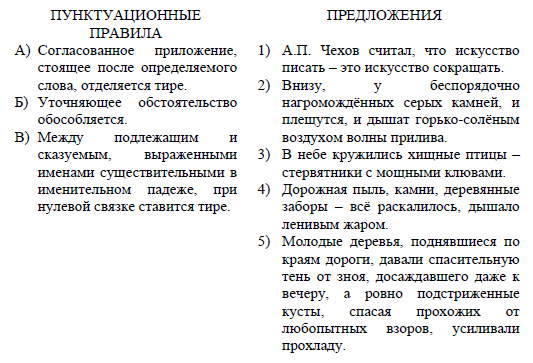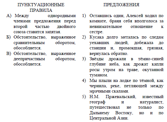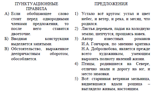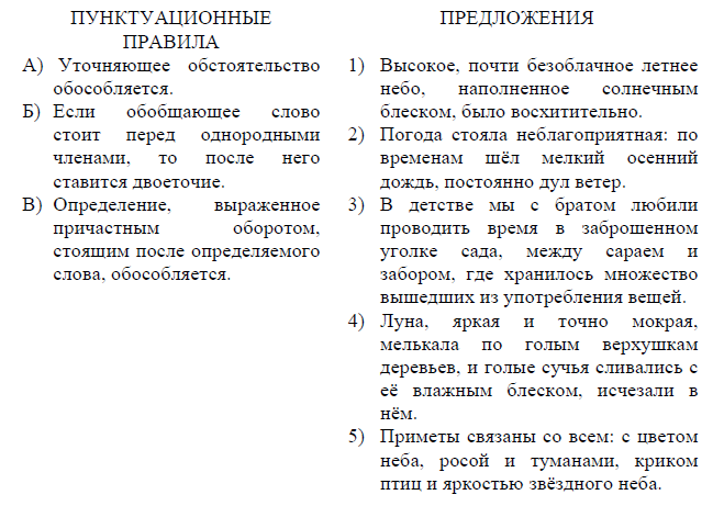 Задание 4. Установите соответствие между пунктуационными правилами и предложениями, которые могут служить примерами для приведённых пунктуацинных правил. К каждой позиции первого столбца подберите соответствующую позицию из второго столбца
