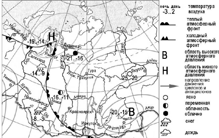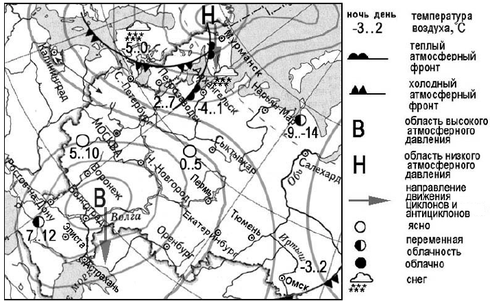 Задание 5. Какой из перечисленных населённых пунктов, показанных на карте, находится в зоне действия антициклона?