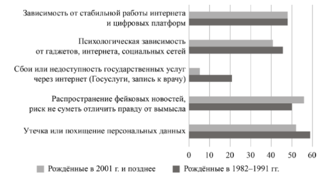 Задание 12. В ходе социологического исследования совершеннолетние граждане ответили на вопрос «Какие риски цифровизации Вы считаете наиболее опасными для себя?» (можно было дать несколько ответов). Результаты исследования (в % от числа опрошенных) представлены в виде диаграммы.