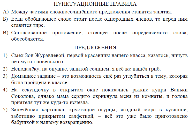 Задание 4. Установите соответствие между пунктуационными правилами и предложениями, которые могут служить примерами для приведённых пунктуационных правил. К каждой позиции первого списка подберите соответствующую позицию из второго списка.