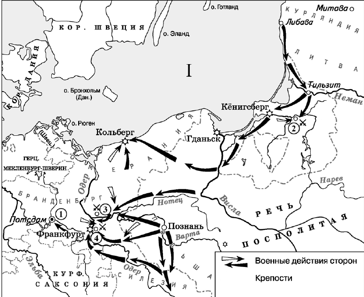 «В июле в войну с Пруссией вступила Россия. Русская армия во главе с генерал-фельдмаршалом С.Ф. Апраксиным направилась в Восточную Пруссию и заняла Мемель, Тильзит и другие города. Перед ней была поставлена задача взять столицу Восточной Пруссии Кёнингсберг, возле которого находилась 40-тысячная прусская армия. 19 августа у небольшого селения __ состоялось одно из крупнейших сражений войны, в ходе которого прусская армия была разбита. <…> Новым командующим армией был назначен генерал В.В. Фермор. Уже через месяц ему удалось занять
