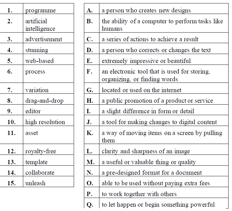 Задание 4. Imagine you are choosing a graphic design programme based on AI to make a poster for your project. Below is the information you read in the advertisement. Read the information and do the following tasks.